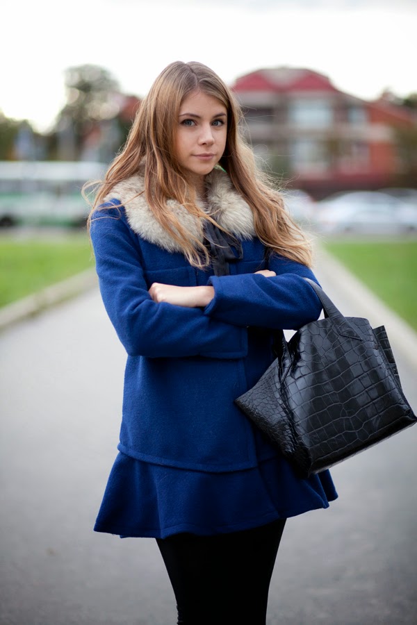 Today I wear one of my favorite coats lately. I wear it with jeans, oxford boots or heels. It's so lovely, again blue as almost all the clothes which I buy this fall, it goes well with all kinds of scarves, shawls and my favourite fur boas!